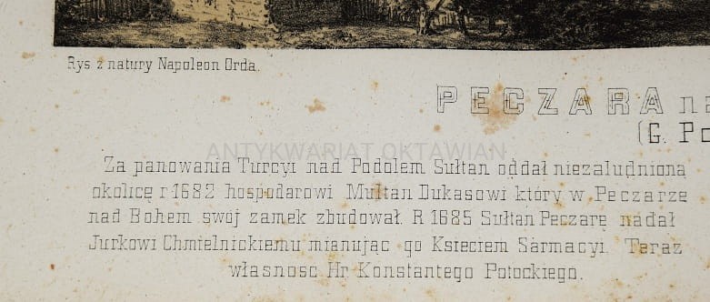 "Za panowania Turcyi nad Podolem sułtan oddał niezaludnioną okolicę r. 1682 hospodarowi Multan Dukasowi który w Peczarze nad Bohem swój zamek zbudował. R. 1685 Sułtan Peczarę nadał Jurkowi Chmielnickiemu mianując go księciem Sarmacyi. Teraz własność Hr. Konstantego Potockiego."