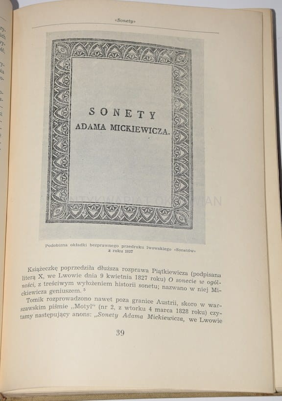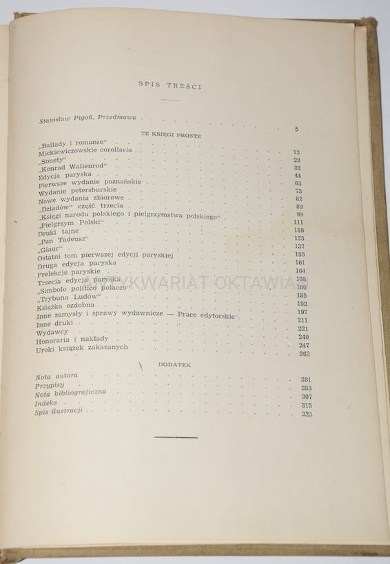 W treści: „Ballady i romanse", Mickiewiczowskie corollaria, „Sonety", „Konrad Wallenrod", Edycja paryska, Pierwsze wydanie poznańskie, Wydanie petersburskie, Nowe wydania zbiorowe, „Dziadów" część trzecia, „Księgi narodu polskiego i pielgrzymstwa polskiego", „Pielgrzym Polski", Druki tajne, „Pan Tadeusz", „Giaur", Ostatni tom pierwszej edycji paryskiej, Druga edycja paryska, Prelekcje paryskie, Trzecia edycja paryska, „Simbolo politico polacco", „Trybuna Ludów", Książka ozdobna, Inne zamysły i sprawy wydawnicze — Prace edytorskie, Inne druki, Wydawcy, Honoraria i nakłady, Uroki książek zakazanych.
